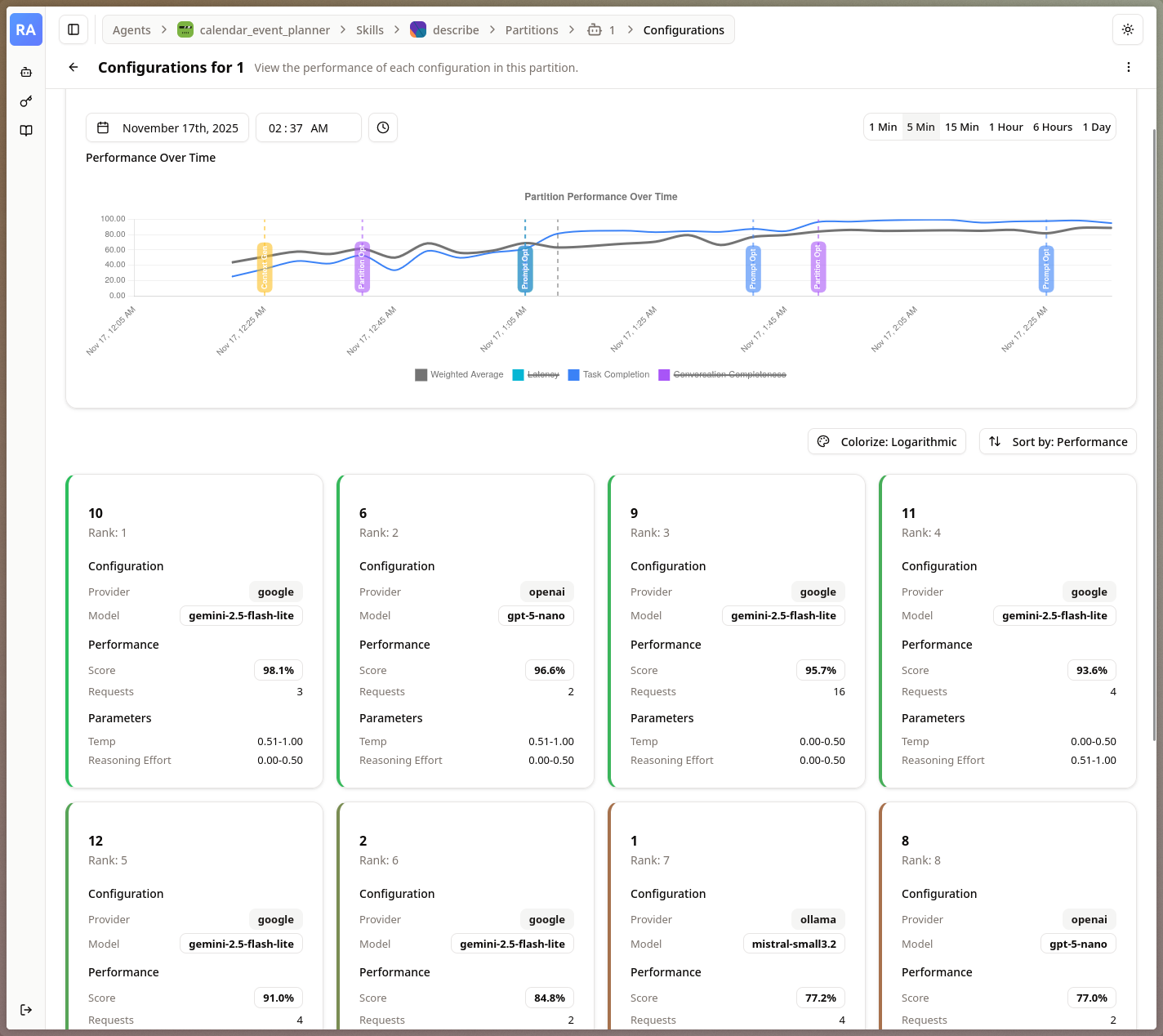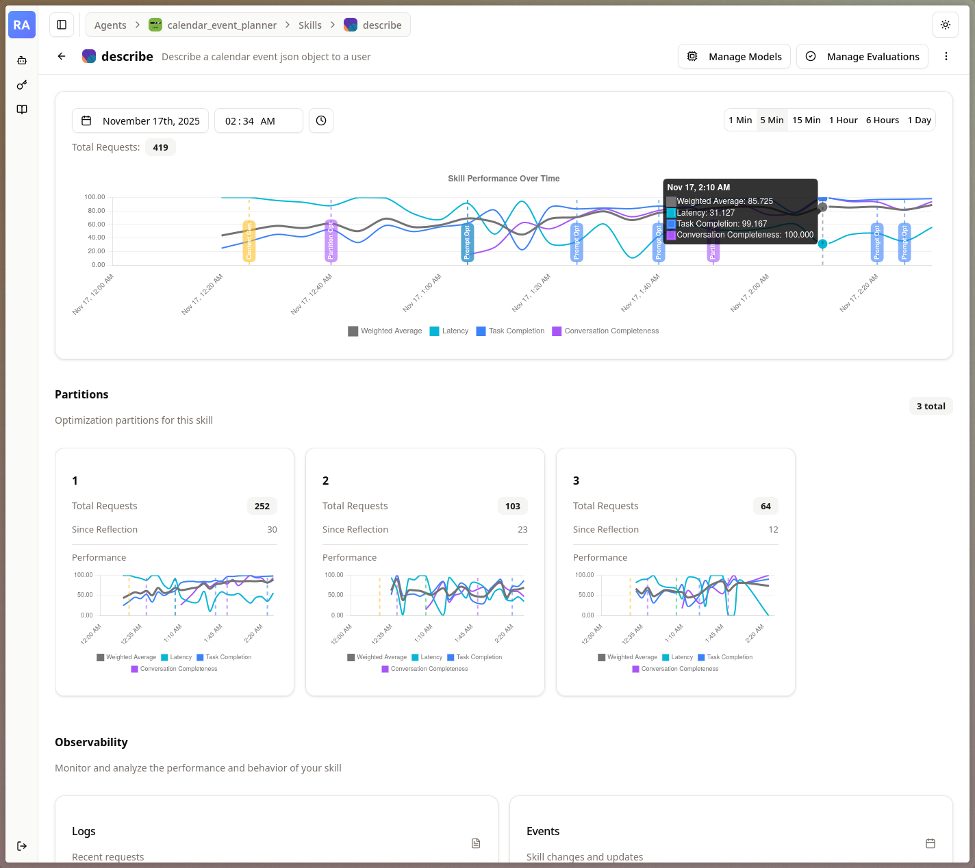 - Reactive agents can reach higher performance than regular agents by design. A central aspect of the reactive agent implementation is that each node within an agent has built-in support for request partitioning. Each partition has its own configuration that optimizes performance for a subset of requests sent to a node. A node can automatically route requests based on various characteristics, such as semantic meaning, input token length, etc. (depending on the implementation). For example, it could turn out that a node sends 70% of the requests to Claude Sonnet 4.5, 20% to GPT 5.1, and 10% to a custom model.